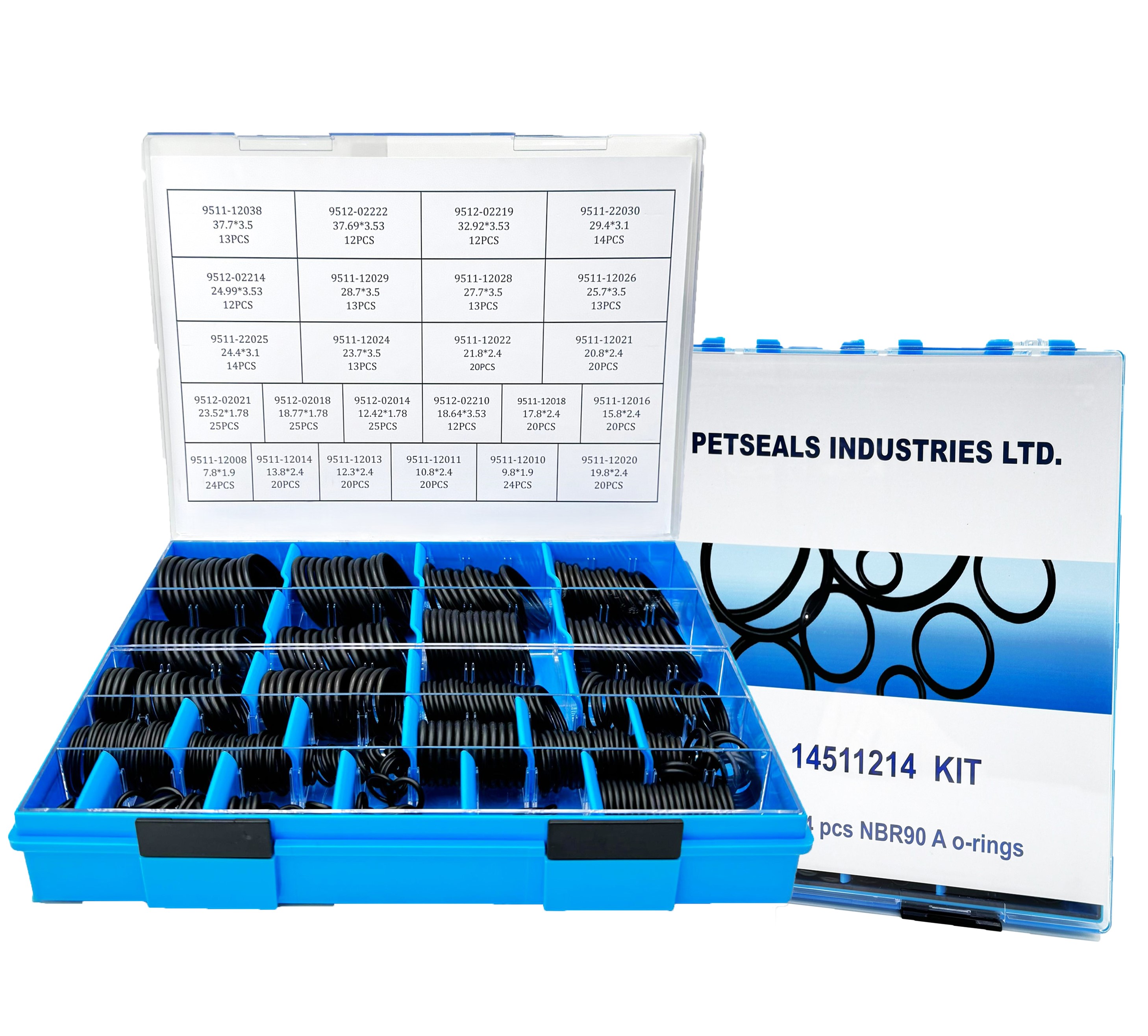Composto por 424 peças distribuídas em 24 medidas diferentes de anéis O-ring.